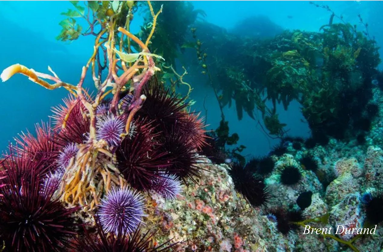 A pesar de estos escudos químicos, los efectos del cambio climático siguen siendo un reto de adaptación para las macroalgas, por su efecto negativo. Un efecto en los océanos derivado del cambio climático es la disminución de la salinidad del agua de mar. Esto influye en una menor producción de florotaninos, un tipo de compuestos que producen las algas pardas y que usan como sistema de protección ante la radiación UV y al ataque de herbívoros. Al disminuir estos metabolitos, las macroalgas son más susceptibles a ser consumidas por herbívoros, como los erizos de mar, que llegan a mermar significativamente a las poblaciones de algas (Figura 4).